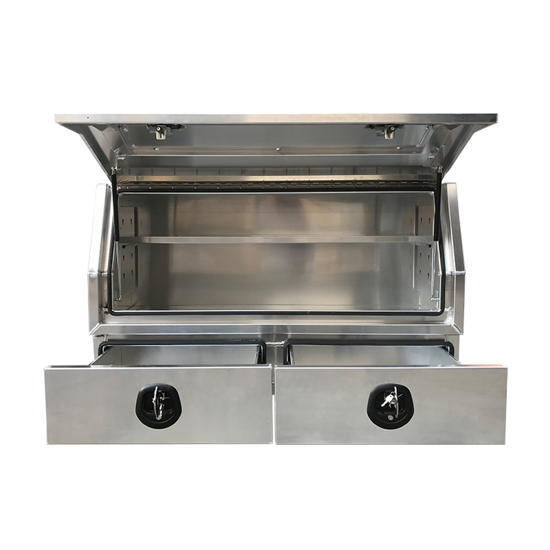 这是一款 1450*600*850 毫米车用扁平合金工具箱,带有 2 个滑动抽屉。采用凹门设计,避免撬动;气撑杆安装在门上,在开门和关闭门时起到缓冲作用;盒子配有可调节的隔板,可以更灵活地存放物品。箱内共装有5个鲸尾锁,确保货物安全;底部的 2 个抽屉也可以用 53 毫米宽的重型滚珠轴承滑轨锁定。可承重约120kg。保护您的工具更安全。