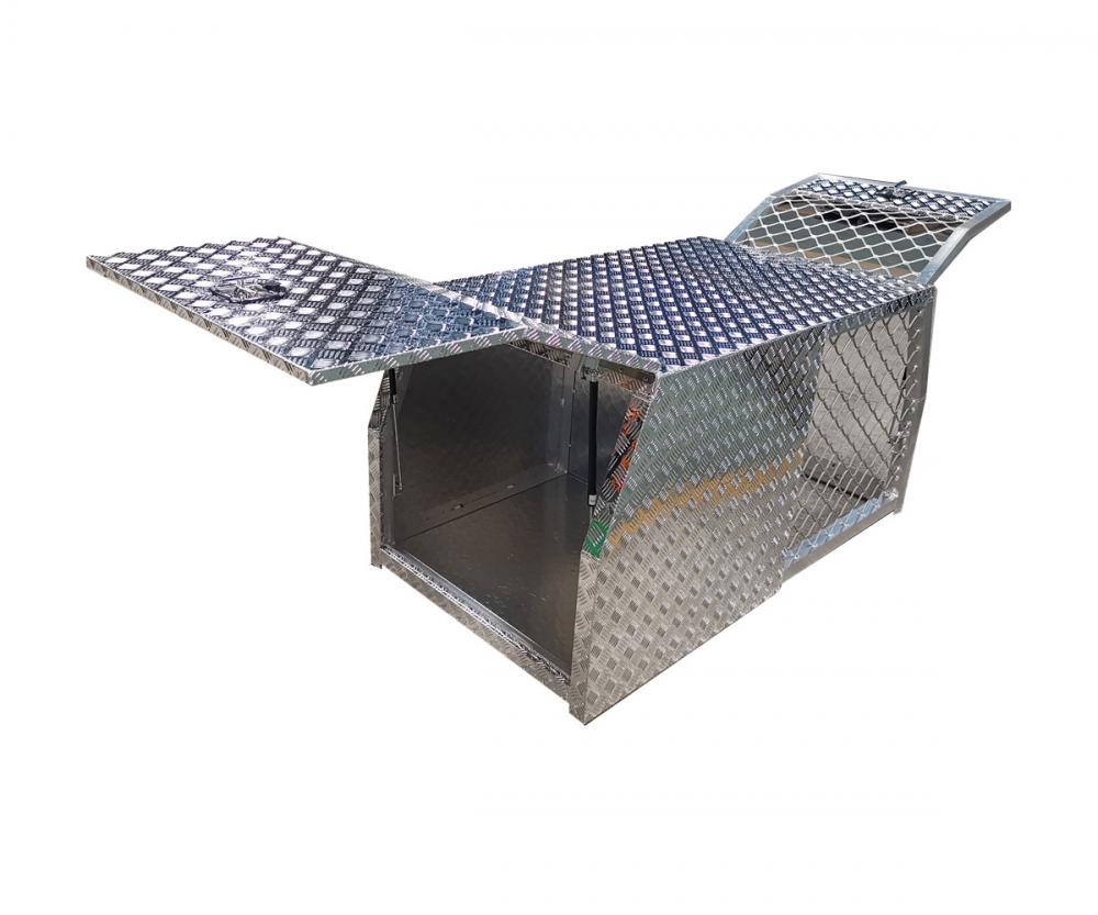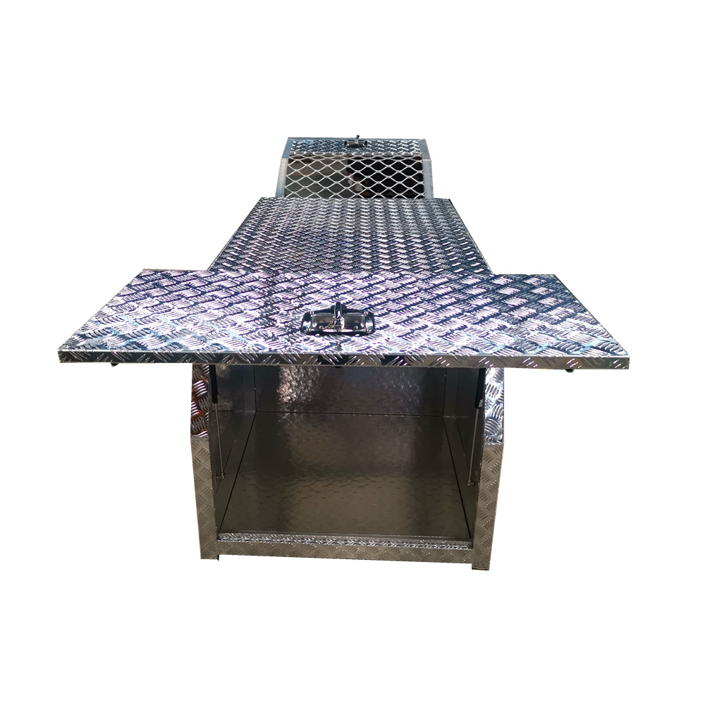 这款 UTE 狗箱非常适合户外探险或狩猎旅行。它是半工具箱和半狗箱设计,狗箱另一侧可选的重型滑轨用于冰箱或发电机。狗箱只需简单的工具即可轻松安装在UTE车架上,这在澳大利亚和新西兰市场非常受欢迎。它采用优质铝格板和铝网构造,全焊接,全身采用肋条加固,使整个工具箱更加坚固耐用。门上的软密封橡胶可以有效防止灰尘和水进入,气撑杆便于打开和关闭。它具有 2 套高品质鲸鱼尾锁,可始终确保您的物品安全。狗笼内的锋利部件经过精心抛光,以确保小狗的爪子和舌头不会被划伤。