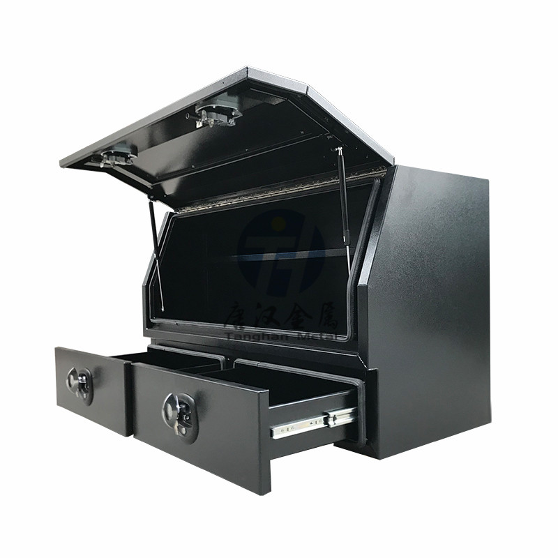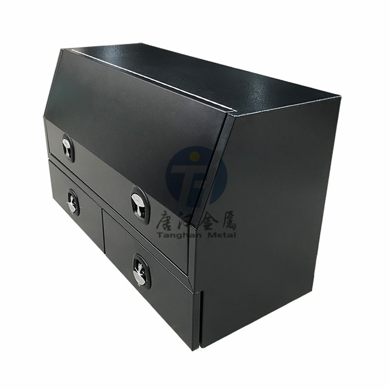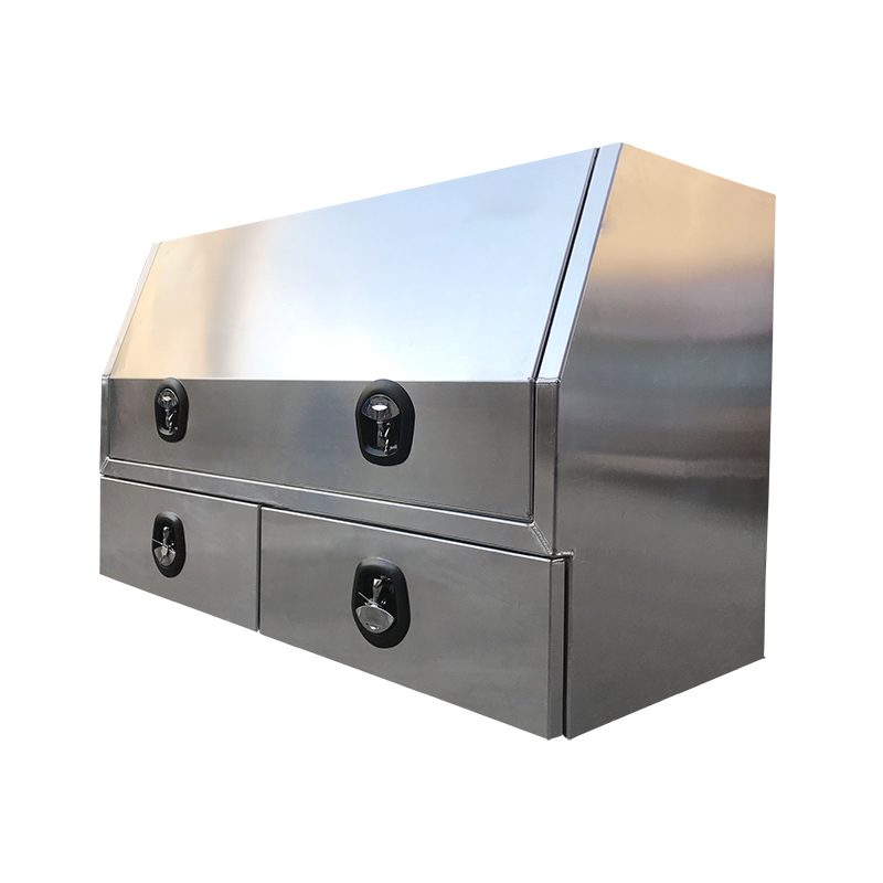 这是一款 1450*600*850 毫米车用扁平合金工具箱,带有 2 个滑动抽屉。采用凹门设计,避免撬动;气撑杆安装在门上,在开门和关闭门时起到缓冲作用;盒子配有可调节的隔板,可以更灵活地存放物品。箱内共装有5个鲸尾锁,确保货物安全;底部的 2 个抽屉也可以用 53 毫米宽的重型滚珠轴承滑轨锁定。可承重约120kg。保护您的工具更安全。